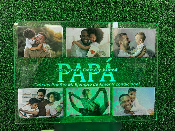 Lampara de acrilico transparente de 3 mm de 20 cm de largo x 15 cm de alto con base de luz variable, con grabado personalizado y fotos impresas de 6 cm de largo x 4 cm de alto