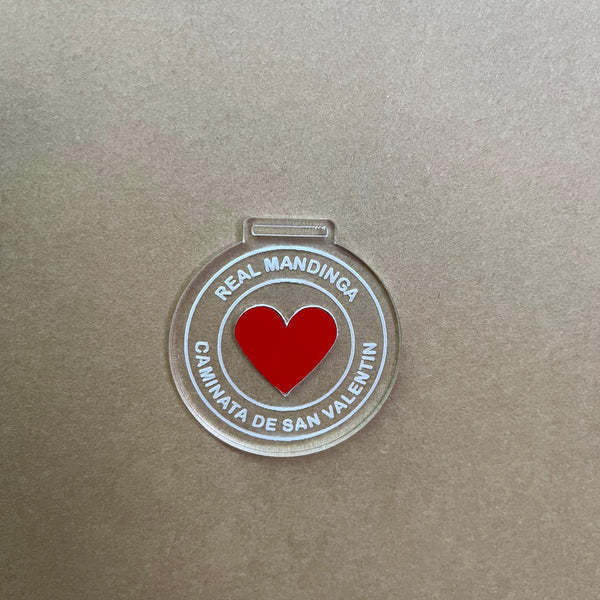 Medalla en acrilico transparente 3 mm de 8 cm de diametro con vinil rojo y grabado laser