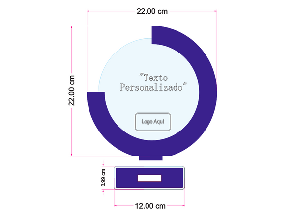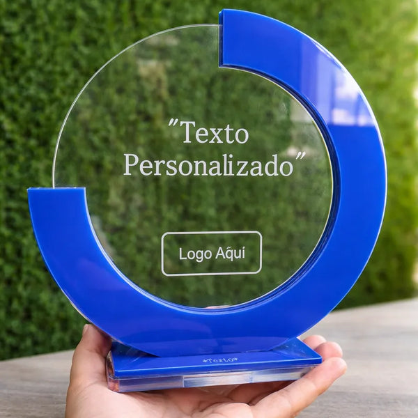 Reconocimiento en acrílico transparente 6 mm de 22 cm de diámetro con relieves en acrílico azul 3 mm con base y grabado laser