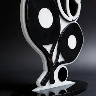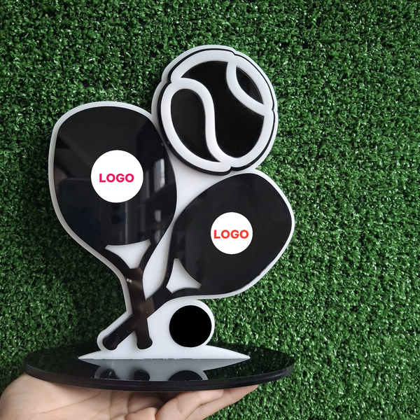 Trofeo en acrílico negro 3 mm con  relieves en acrílico blanco 3 mm, con detalles en vinil impreso