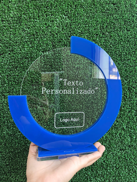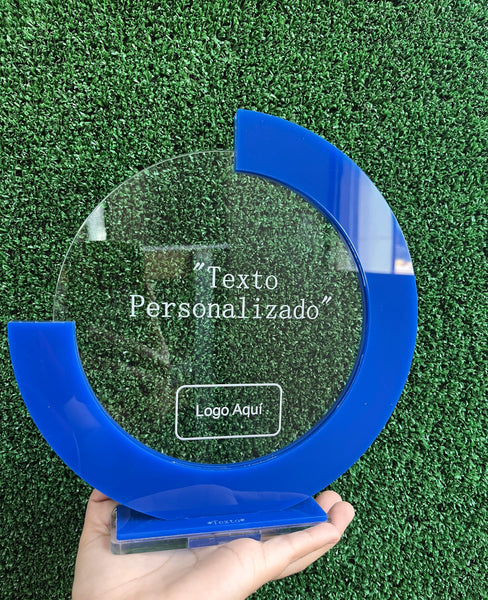 Reconocimiento en acrílico transparente 6 mm de 22 cm de diámetro con relieves en acrílico azul 3 mm con base y grabado laser